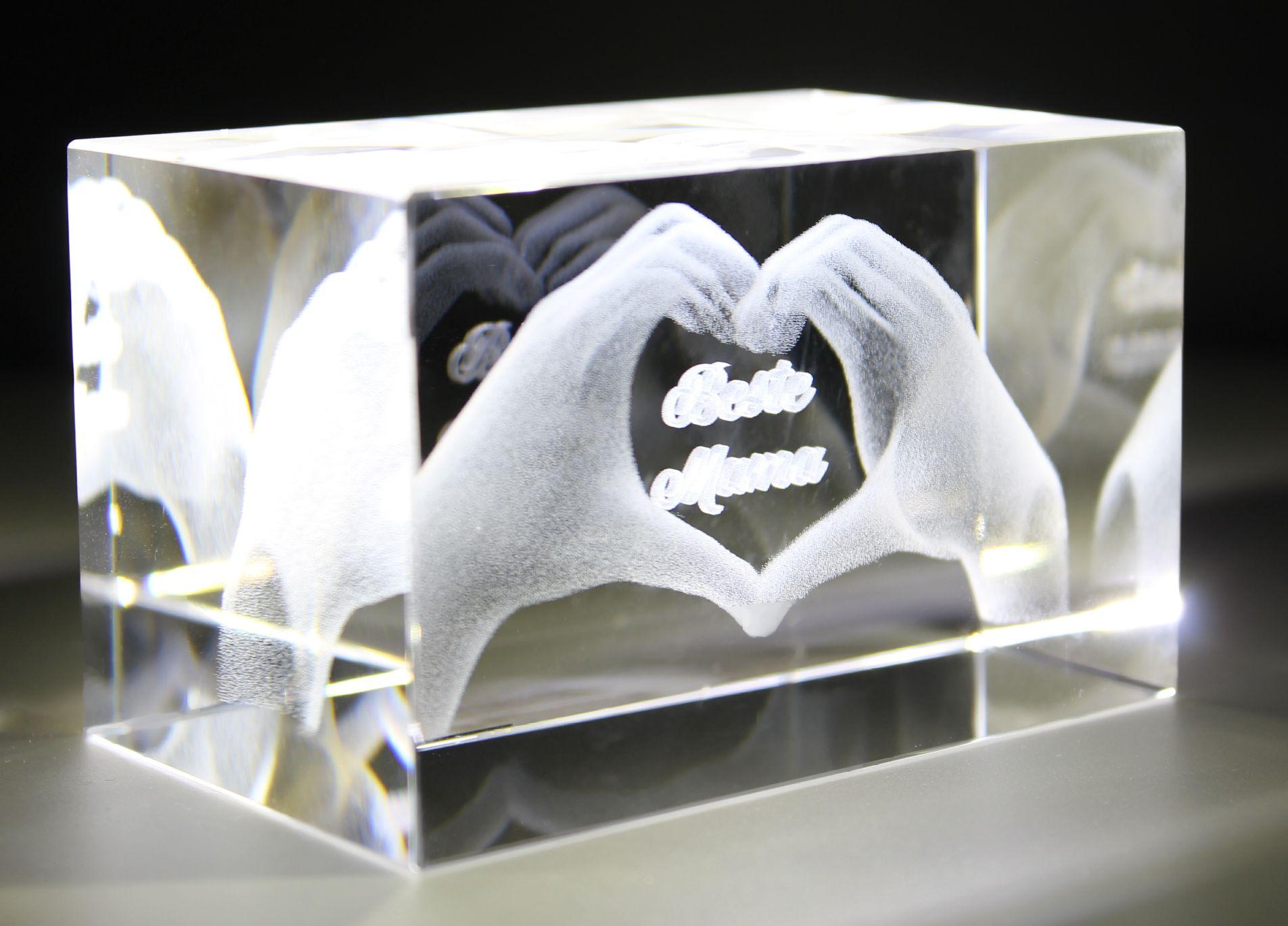 Produktinformationen "3D Glasquader I Herz aus Händen mit Gravur I Text: Beste Mama!"