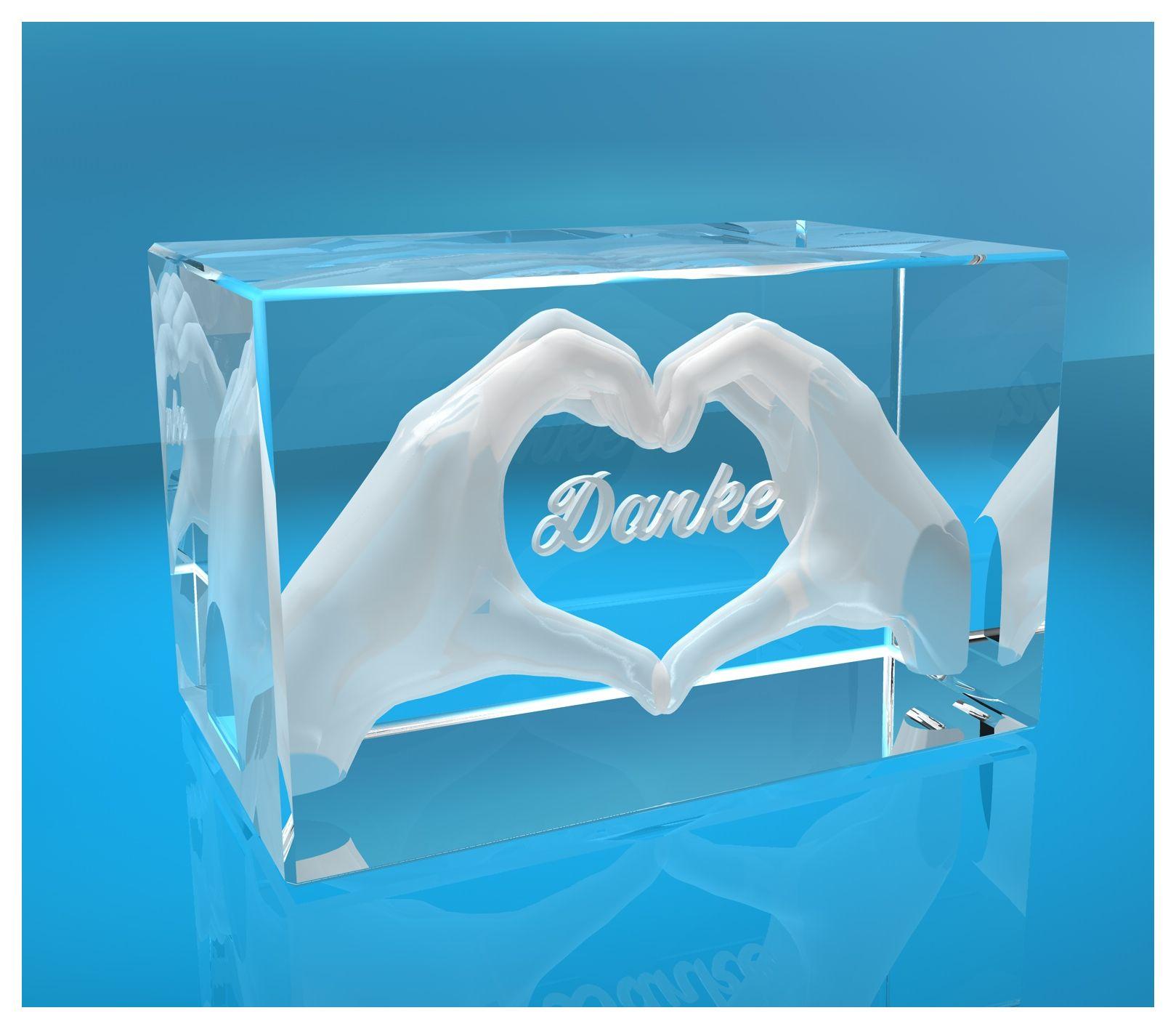 3D Glasquader I Herz aus Händen mit Gravur I Text: Danke