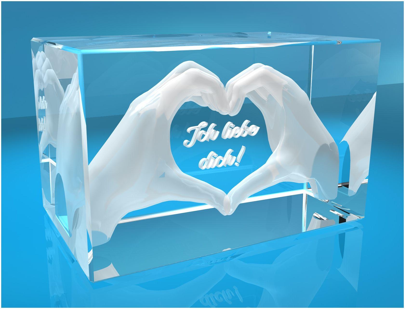 Produktinformationen "3D Glasquader I Herz aus Händen mit Gravur I Text: Ich liebe Dich!"