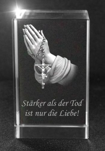 Produktinformationen "3D Glasquader Motiv: Betende Hände Text: Stärker als der Tod ist nur die Liebe!"