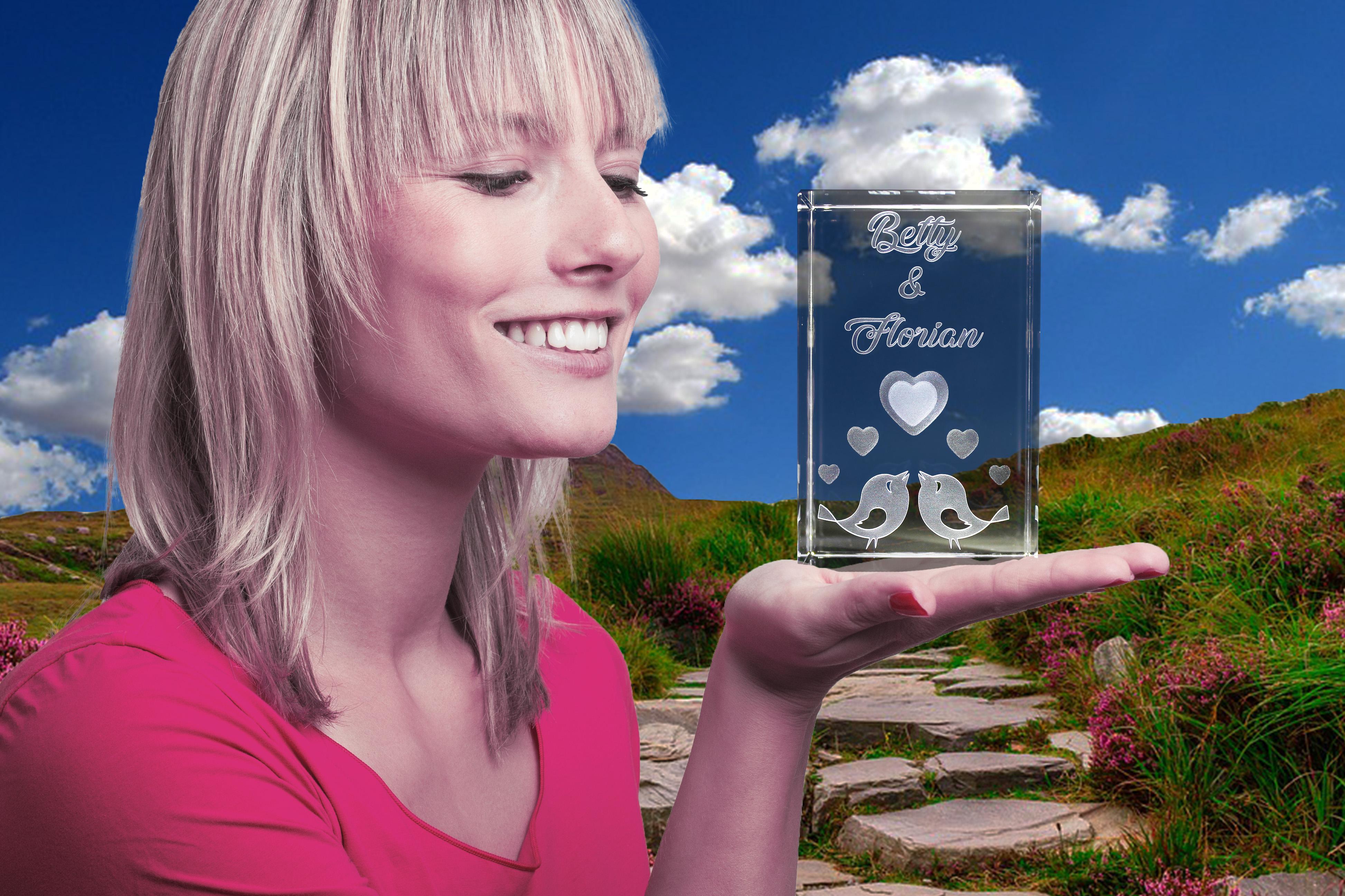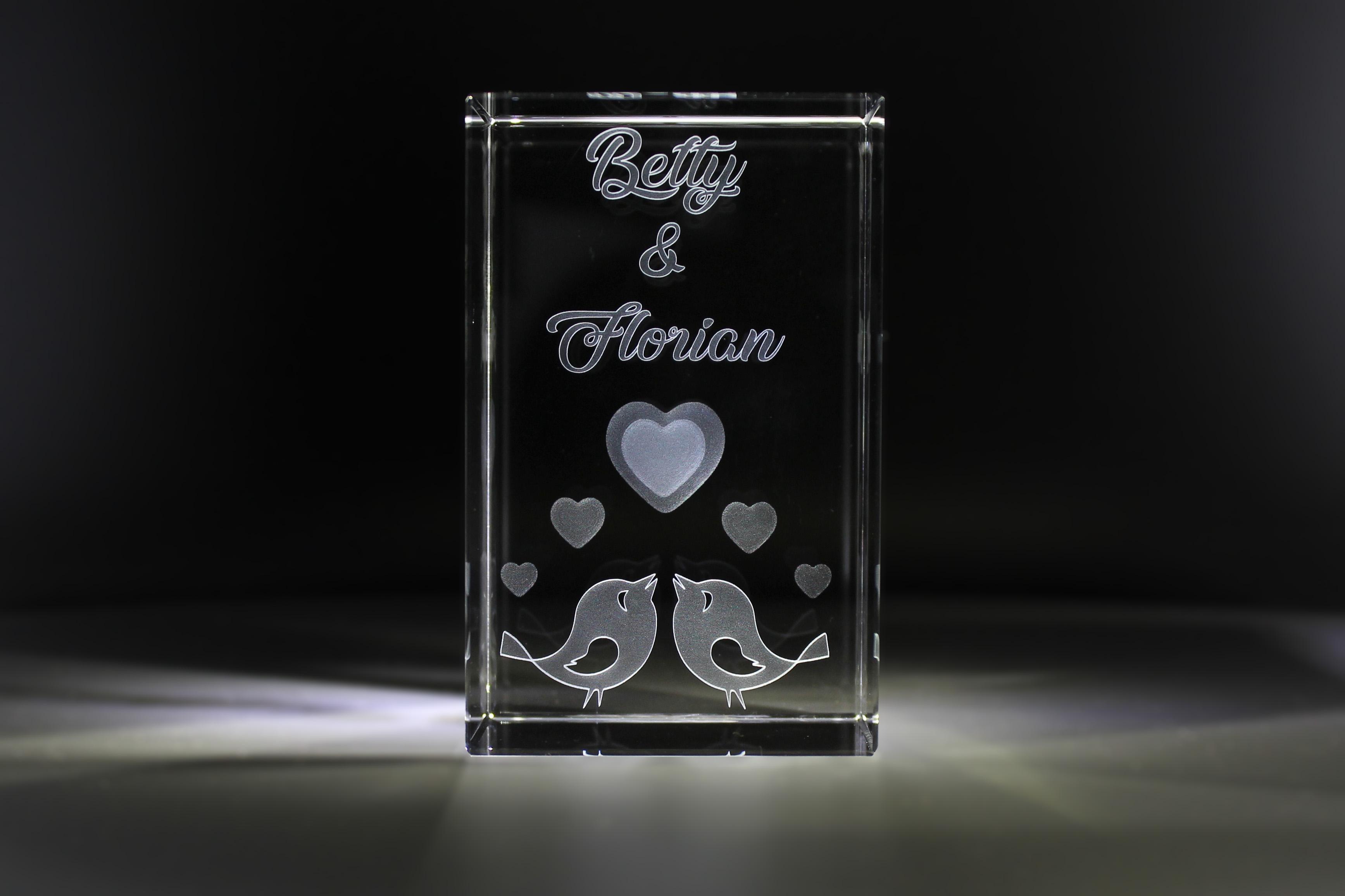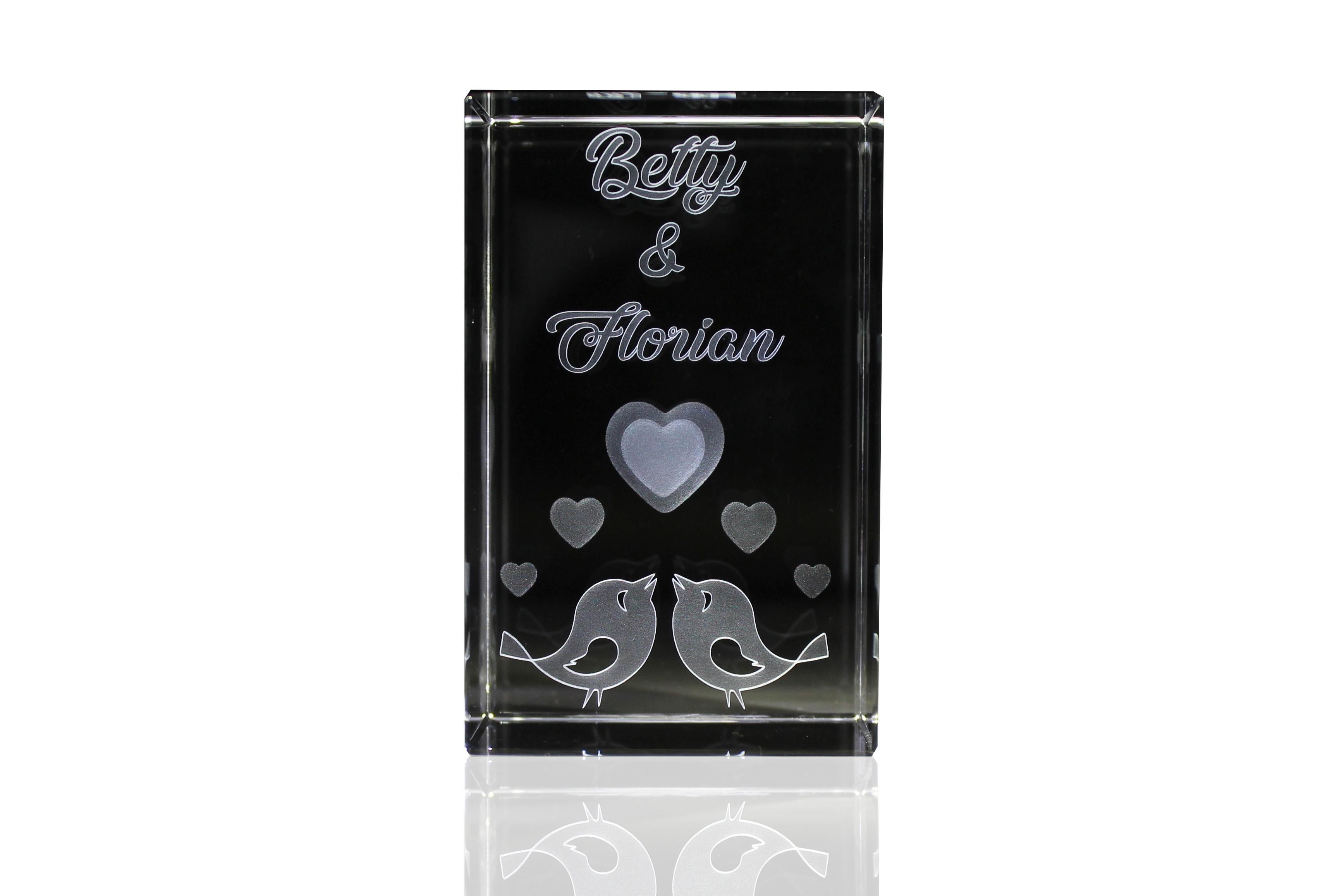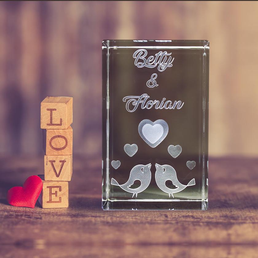 Eigenschaften "3D Glasquader Motiv: Liebesvögel I Gravur mit Deinen Namen"