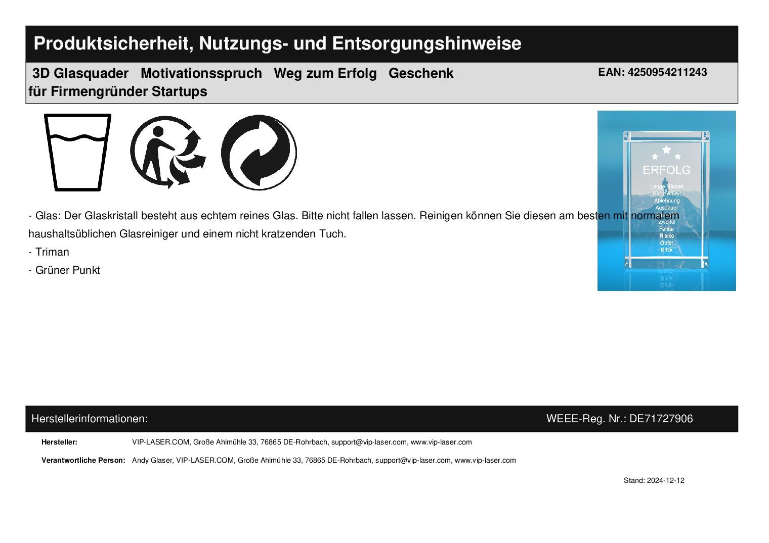 Produktinformationen "3D Glasquader Motivationsspruch Weg zum Erfolg Geschenk für Firmengründer Startups"