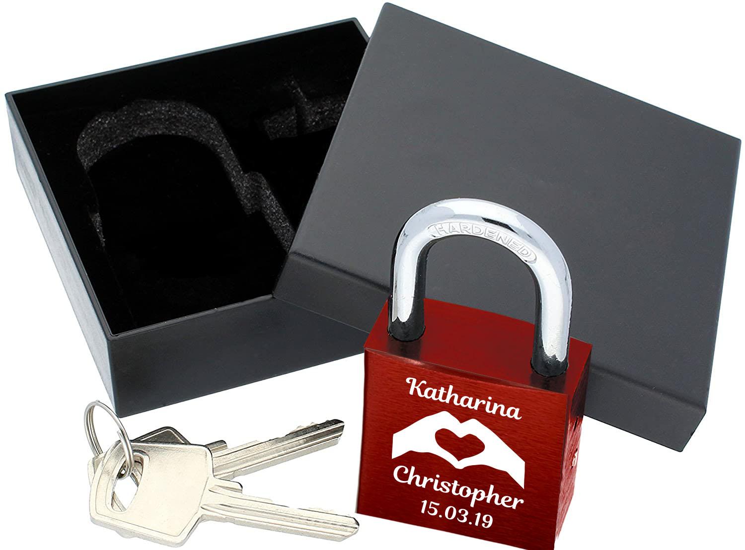 Eigenschaften "ELUNO Liebesschloss mit Deinem Namen, Datum und Herz aus zwei Händen graviert! Farbe: Rot Motiv: M006"