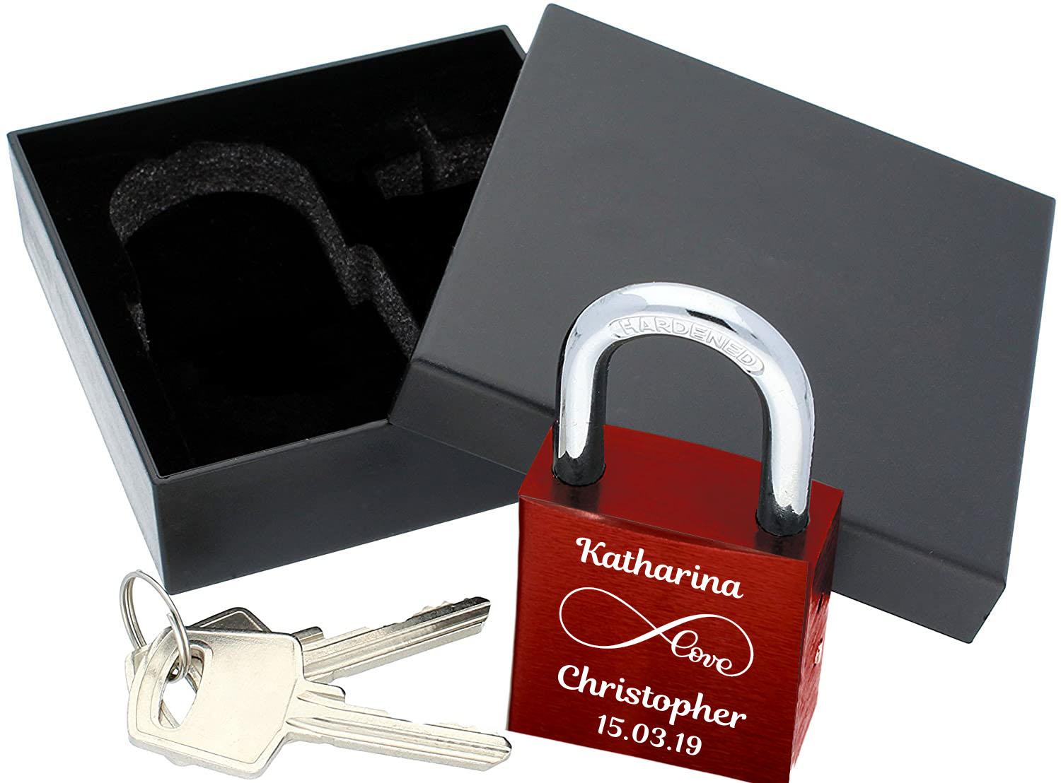 ELUNO Liebesschloss mit Deinem Namen, Datum und Love Unendlichkeitszeichen graviert! Farbe: Rot Motiv: M008