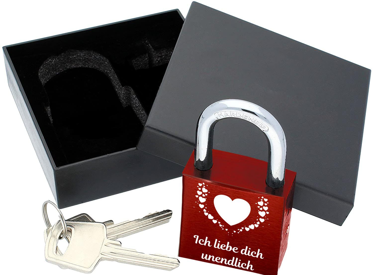 ELUNO Liebesschloss mit Text ich liebe dich unendlich und vielen Herzen graviert! Farbe: Rot Motiv: M015