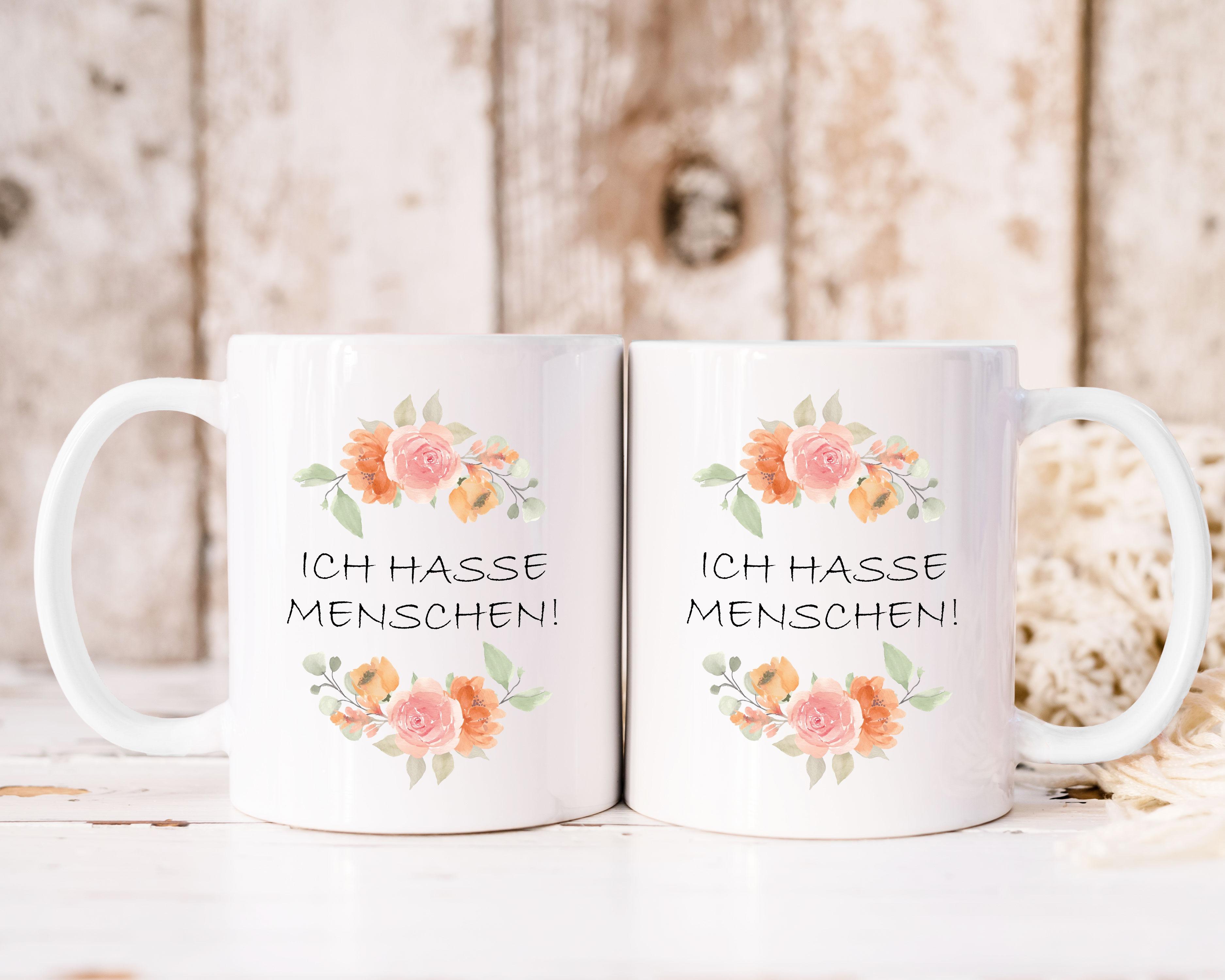VIP-LASER Kaffee-Tasse Blütendekor mit witzigem Spruch | ICH HASSE MENSCHEN