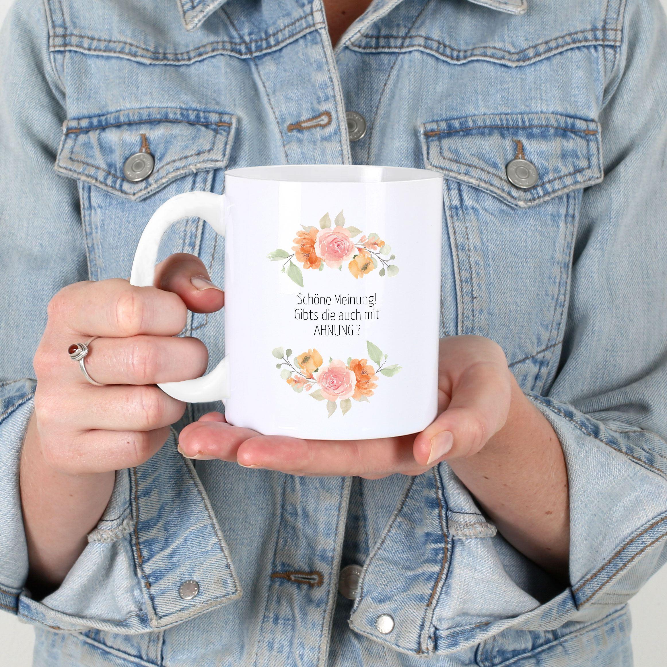 Du bist auf der Suche nach DER ganz besonderen Tasse? Dann hast du hier das perfekte Geschenk zu Weihnachten, Geburtstag oder als kleines Mitbringsel zwischendurch. Natürlich ist sie aber auch der perfekte Alltagsbegleiter für dich selbst! Egal ob auf dem Frühstückstisch oder dem Schreibtisch bei der Arbeit - hier hast du einen echten Hingucker. Mit einem schönen Blumenmotiv kommt der lustige Spruch "Schöne Meinung! Gibts die auch mit AHNUNG?" einher.