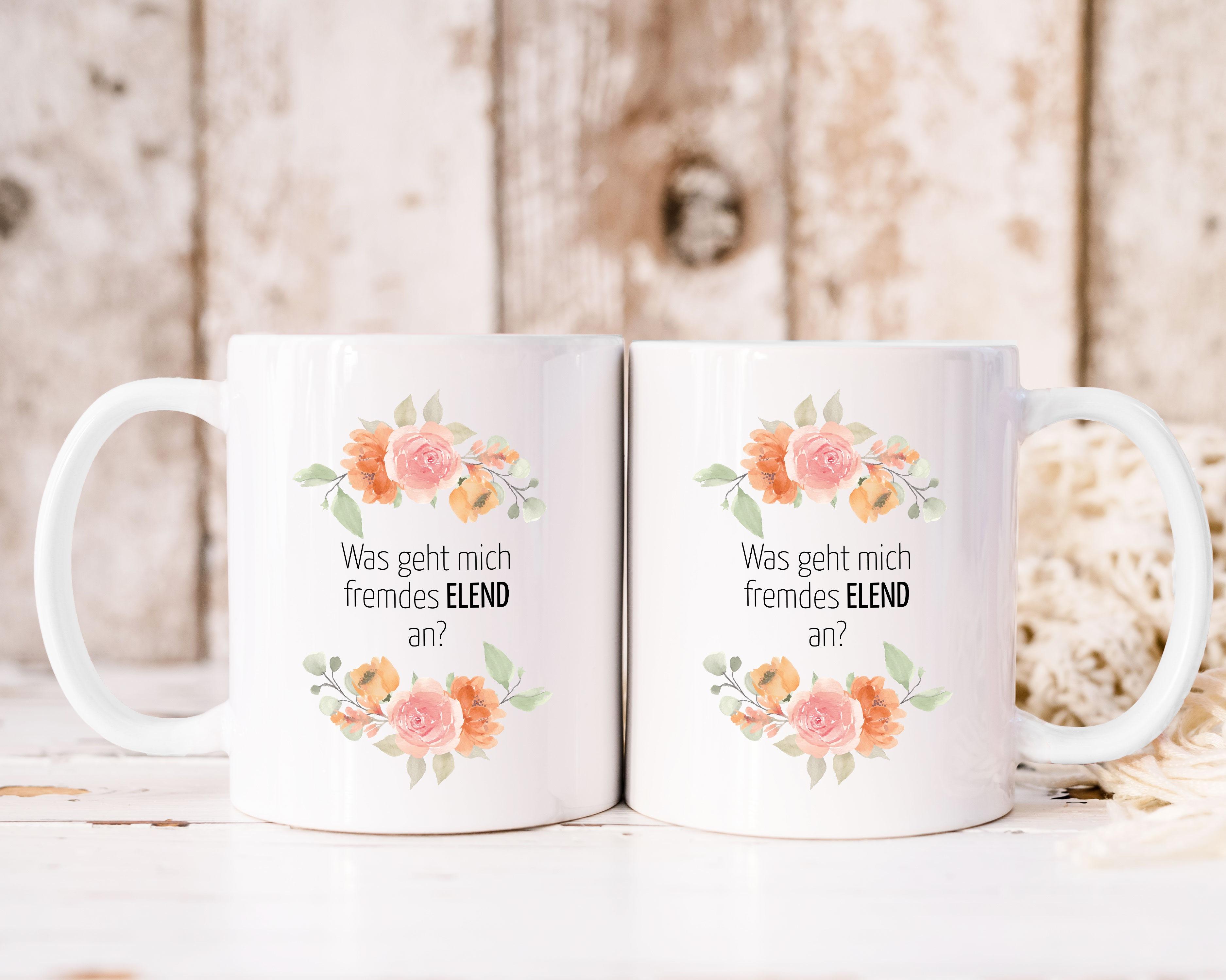 Du bist auf der Suche nach DER ganz besonderen Tasse? Dann hast du hier das perfekte Geschenk zu Weihnachten, Geburtstag oder als kleines Mitbringsel zwischendurch. Natürlich ist sie aber auch der perfekte Alltagsbegleiter für dich selbst! Egal ob auf dem Frühstückstisch oder dem Schreibtisch bei der Arbeit - hier hast du einen echten Hingucker. Mit einem schönen Blumenmotiv kommt der lustige Spruch "Was geht mich fremdes ELEND an?" einher.